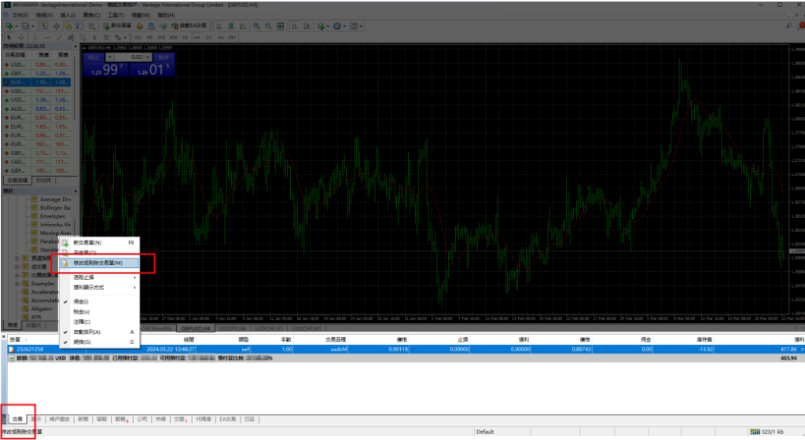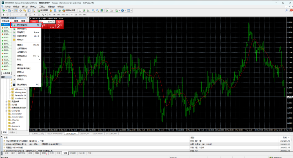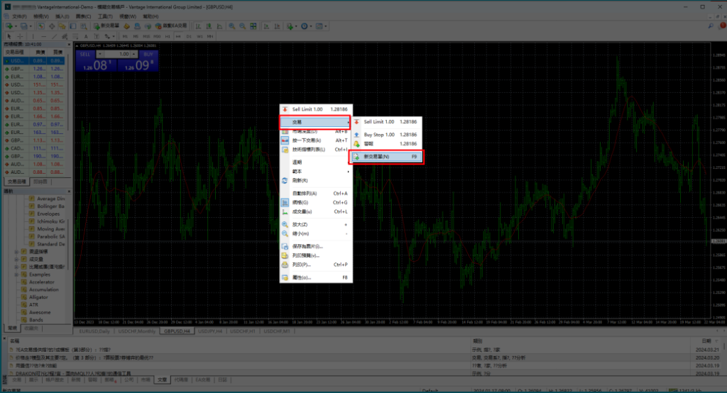 在 MT4 圖表介面,右鍵點擊後選擇 「交易」 功能,並進一步選擇 「新交易單」 來開始一個新的交易。