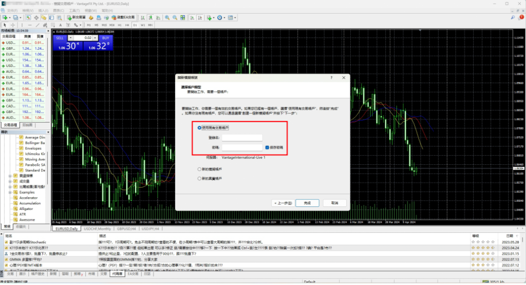 請選擇 「使用現有交易帳戶」,然後輸入您的 MT4 帳號和密碼,最後點擊 「完成」。