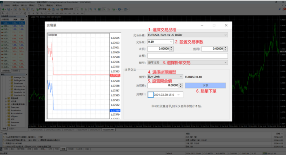 設置您想要的交易手數、選擇交易類型(如買入或賣出)以及確定訂單類型(如市價單、限價單等)。