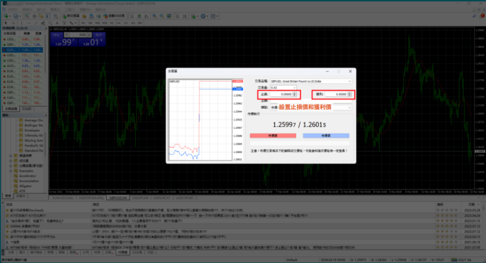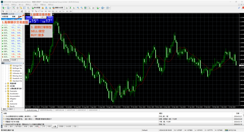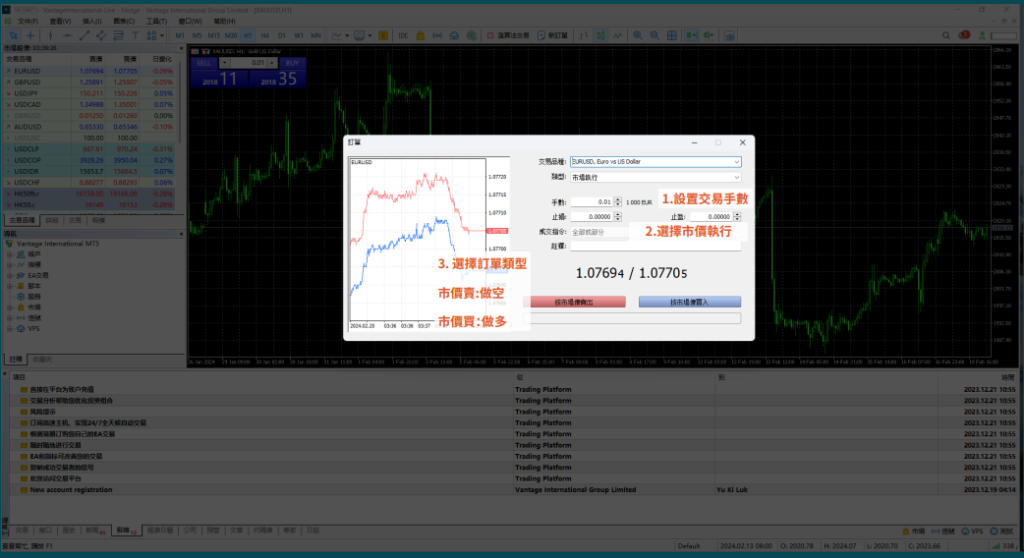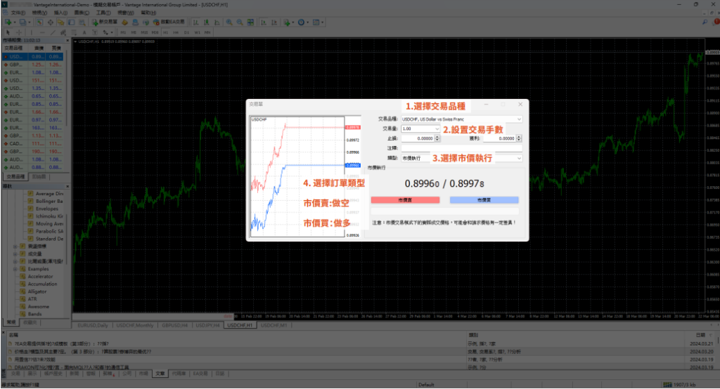 請設置交易手數、選擇交易類型(如買入或賣出)以及訂單類型(如市價單、限價單等)。