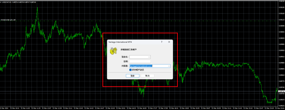 請輸入您的 MT4 帳號和密碼,選擇對應的伺服器,然後點擊 「登錄」。