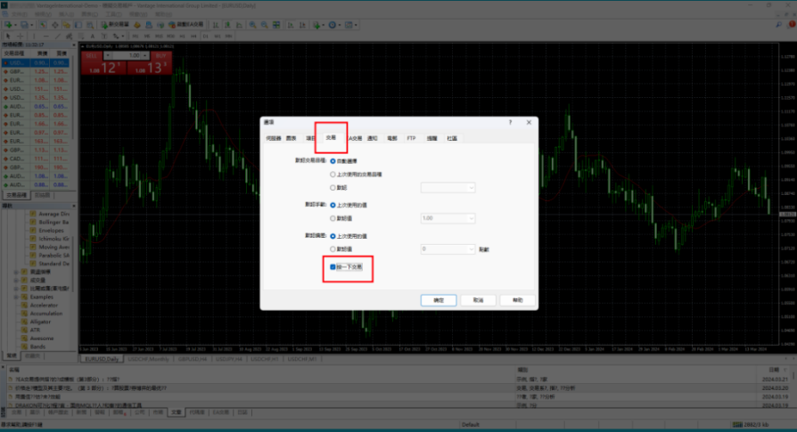 在 「選項」 視窗中,點擊 「交易」,勾選 「按一下交易」。