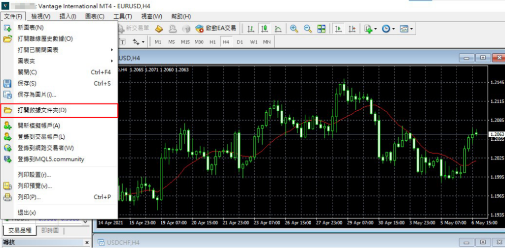 點擊 MT4 介面左上角的 「檔」 功能表,然後選擇 「打開資料檔案夾」。